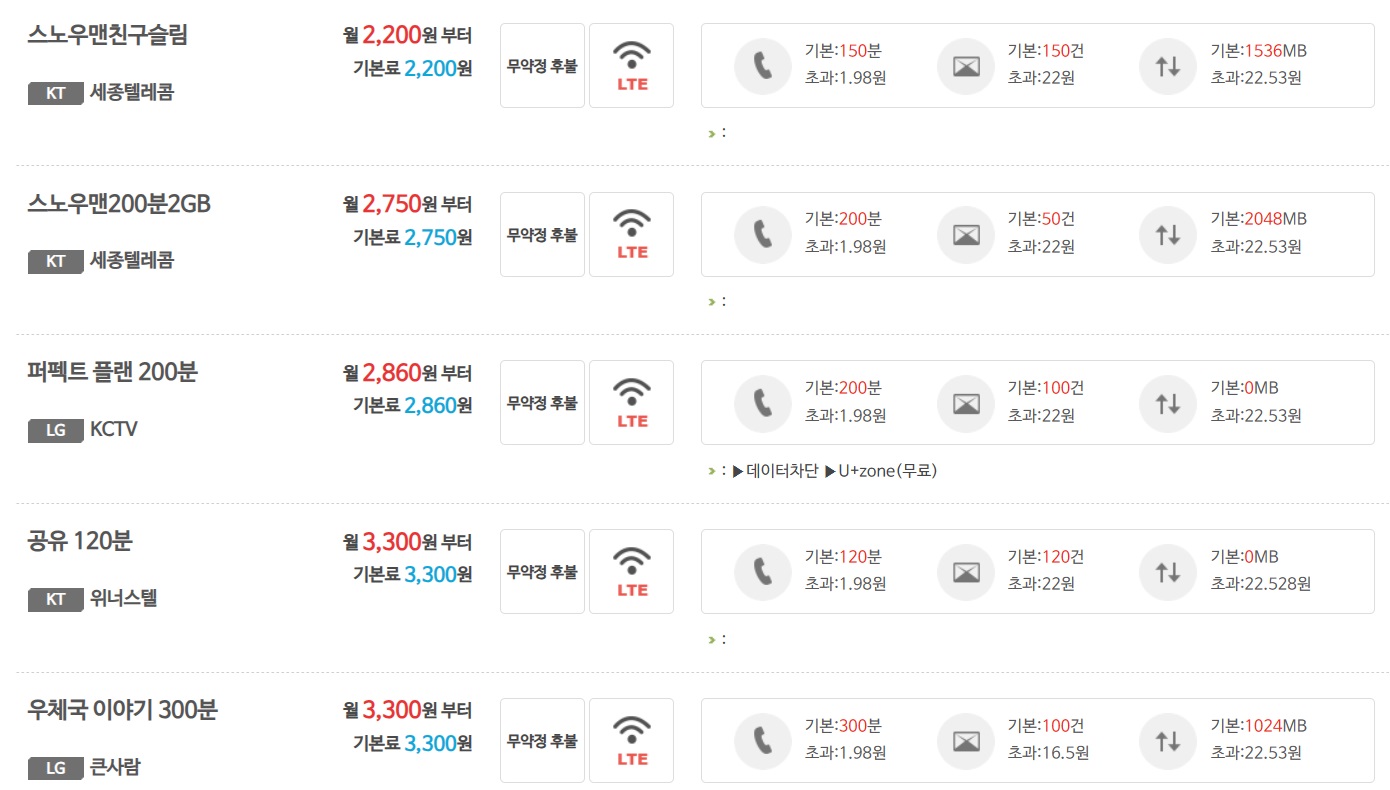 정말 저렴한 가성비 요금제인 세종 텔레콤(KT)의 "스노우맨친구슬림(통화 100분, 데이터 1.5G)" 월 2,200원 요금제도 폰 이용량이 적은 분들 또는 세컨폰을 마련하는 분들에게 아주 인기가 많은 요금제입니다.